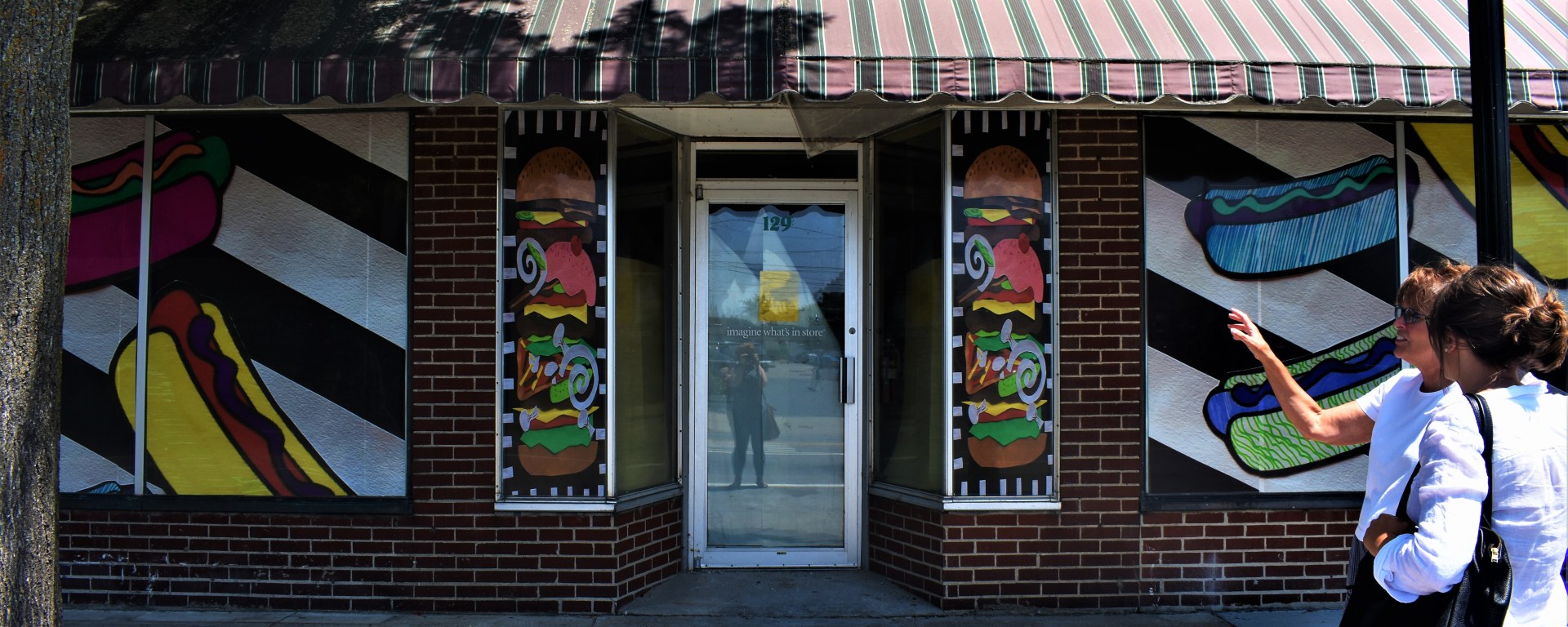 If you’ve been downtown lately, you may have noticed a new pop of color (or three!) in some of the windows. Maybe you were driving along Chisholm and thought to yourself, “was that a giant green hotdog in a hot pink bun on the old Hallmark building?”