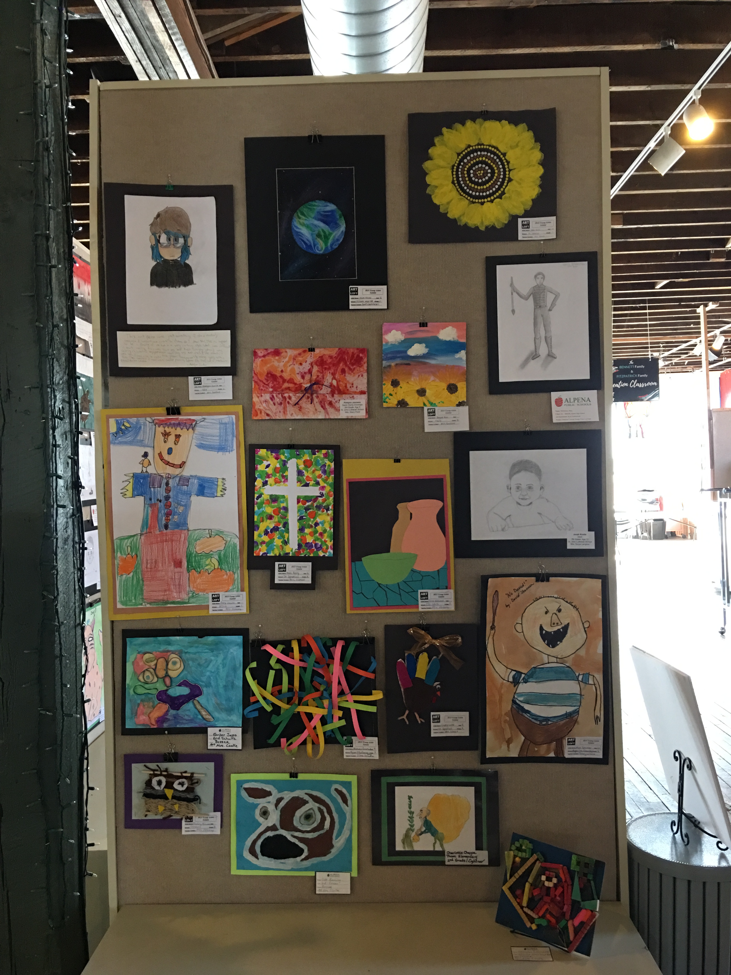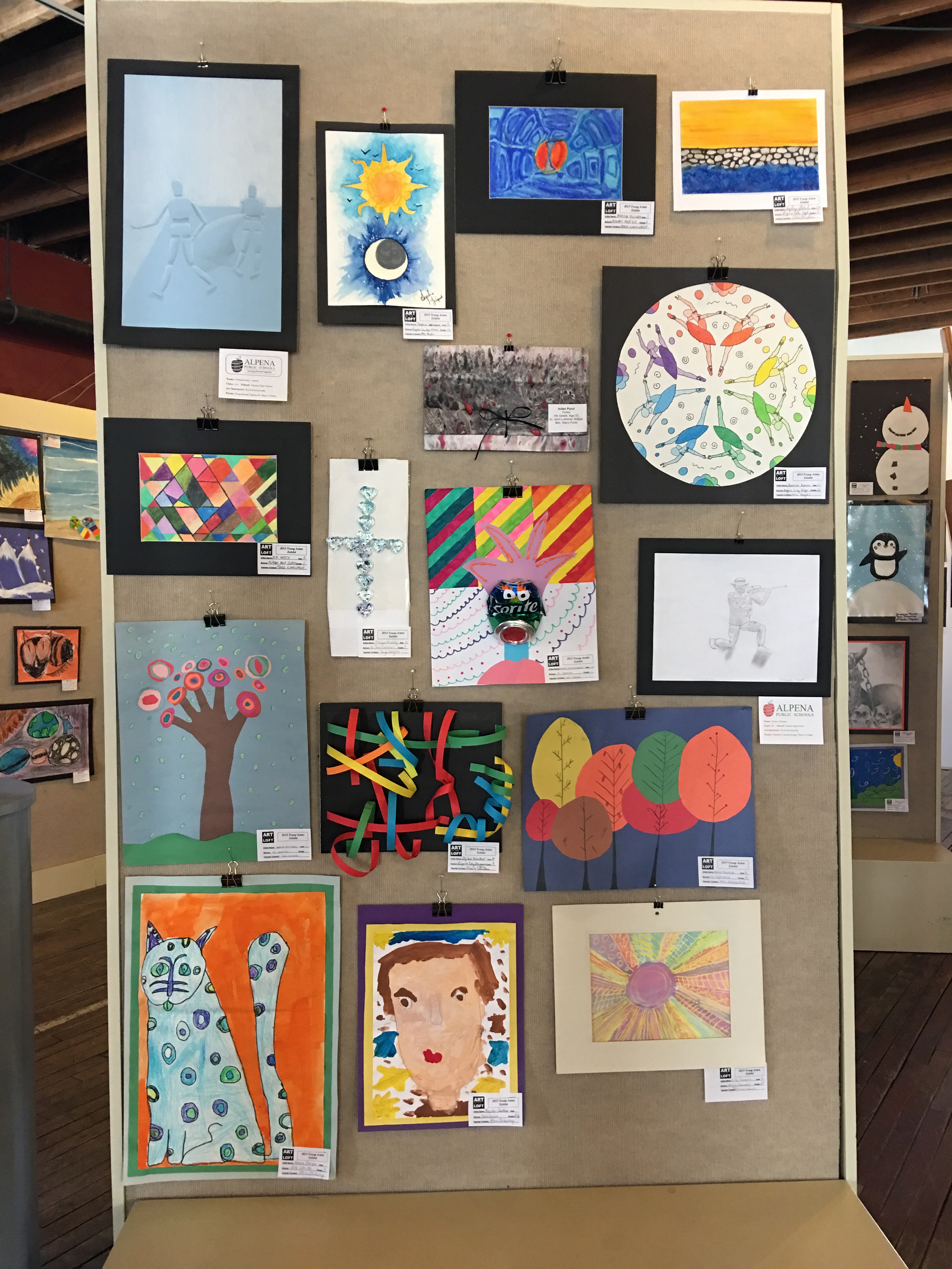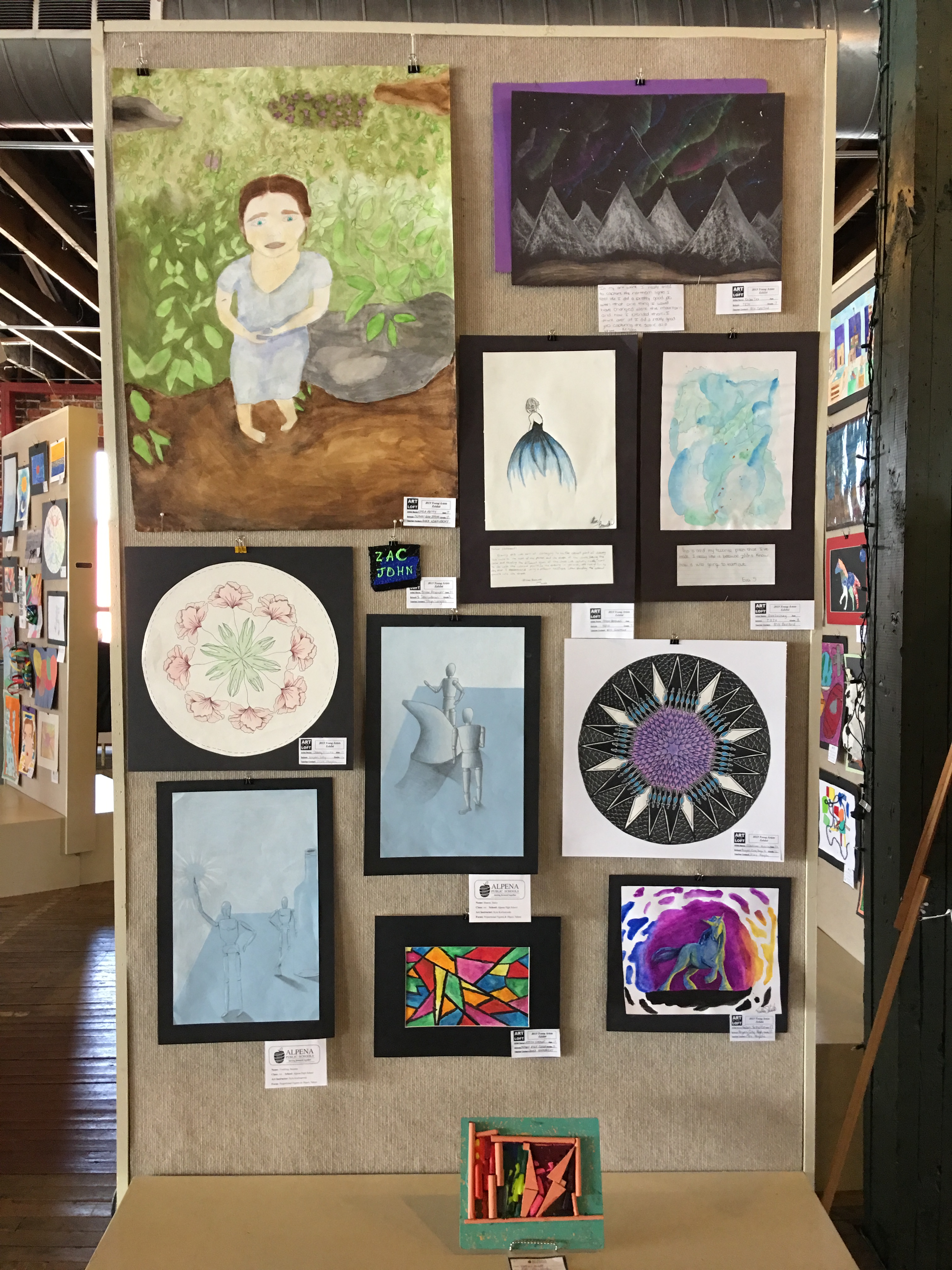 This is the eighteenth year that, for the month of April (specifically today, April 4th, through April 27th), Art in the Loft will be filled with hundreds of vibrant works of art from more than twenty different schools in Alpena and the surrounding areas. From elementary school through high school, twenty five pieces of artwork from each school are selected over the course of the year by art teachers to be showcased at the Young Artist Exhibit. Over the years, the exhibit has really grown and now schools know to look forward to this month and they put a lot of effort and pride into the pieces that they submit. Many schools feel they have reputations to uphold in the gallery and that inspires and encourages their students to create with even more passion and excitement.