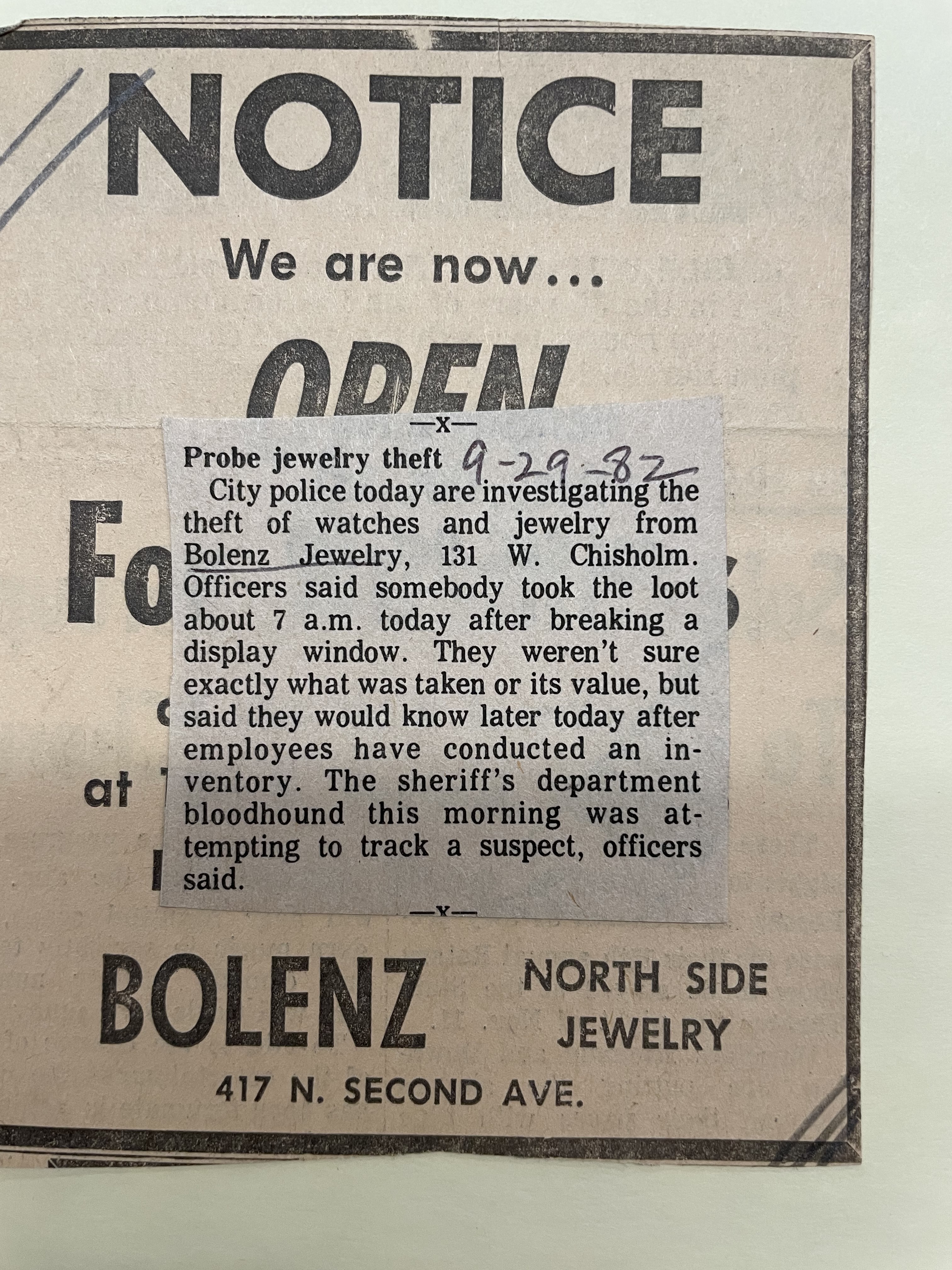 Walter Bolenz was a German immigrant who came to Alpena in the 1920’s. He began a career working for Besser Company. Alongside of his career there, he worked in clock and watch repair because that had been his training in Germany. In Alpena, he became known for his clock and watch repair expertise. During WWII, Besser became a defense contractor, and because Walter was a German national, he was demoted from his position as a foreman at Besser. He never forgave them for that, and after the war he started his own businesses. His first store was where JJ’s Steak & Pizza House is today. He had his business there from about 1947 to 1964 when he moved across the bridge onto 2nd Ave in the block where Nicolet Bank is now. Before Culligan Plaza was created, that section of the block was all storefronts. He was there until 1979 when the city was planning to tear that block down to make Culligan Plaza and First Federal. At that point he moved to where Bolenz Jewelry is currently located. During that same year, Walter retired as he had been sick. He turned the business over to his daughter, Susan, and his son-in-law, Bob Adams, who both had been working with Walter from the 50’s on. From 1979 to 1992 they ran the store until Wayne Calkins and his wife bought it from them. They have been running it ever since. In 2001, Bolenz expanded, and they purchased the space next door that used to house the Michigan Consolidated Gas Company when that company moved out. They started out as just Wayne and his wife, and the next year they added one more employee and have slowly expanded since then.