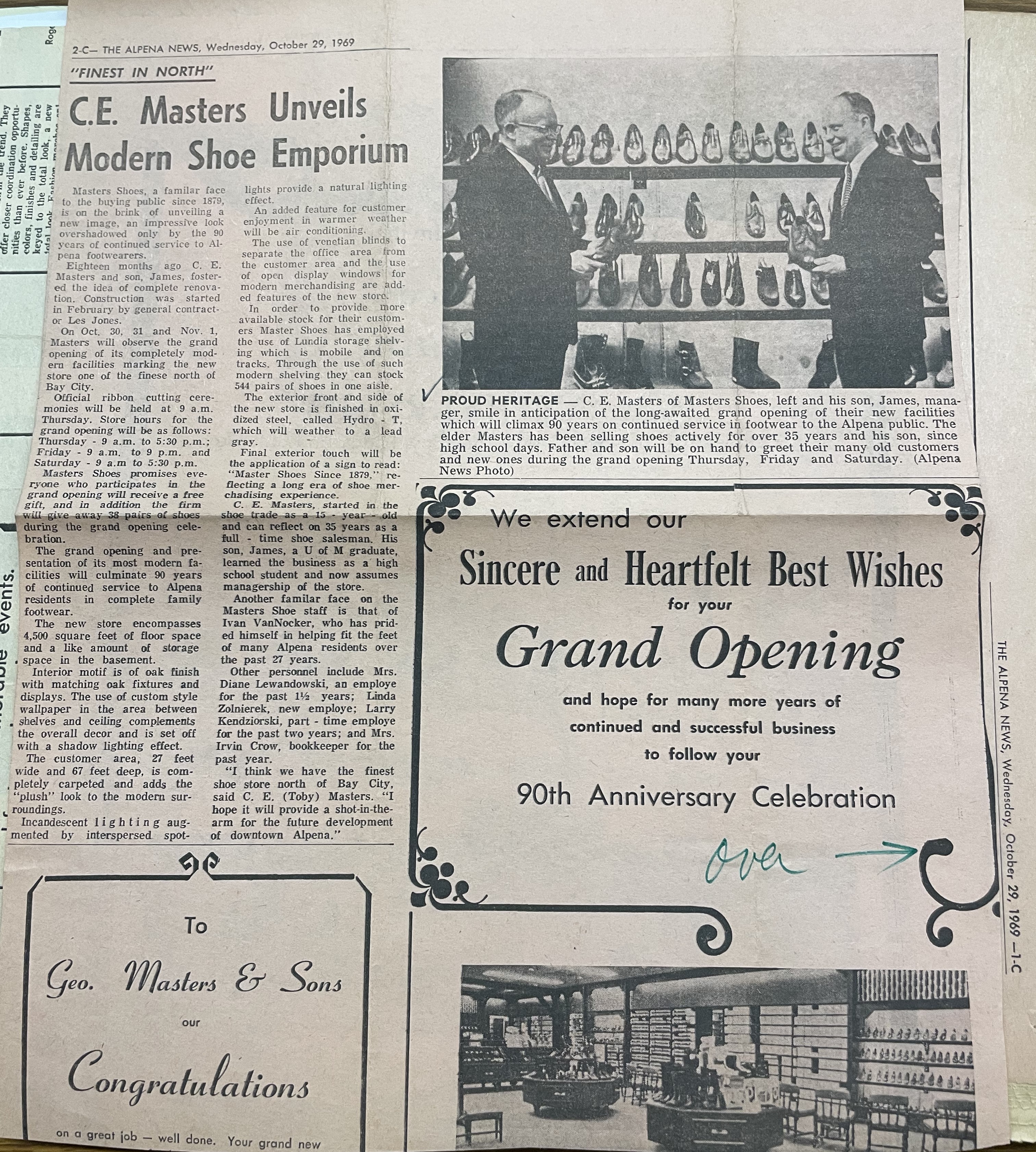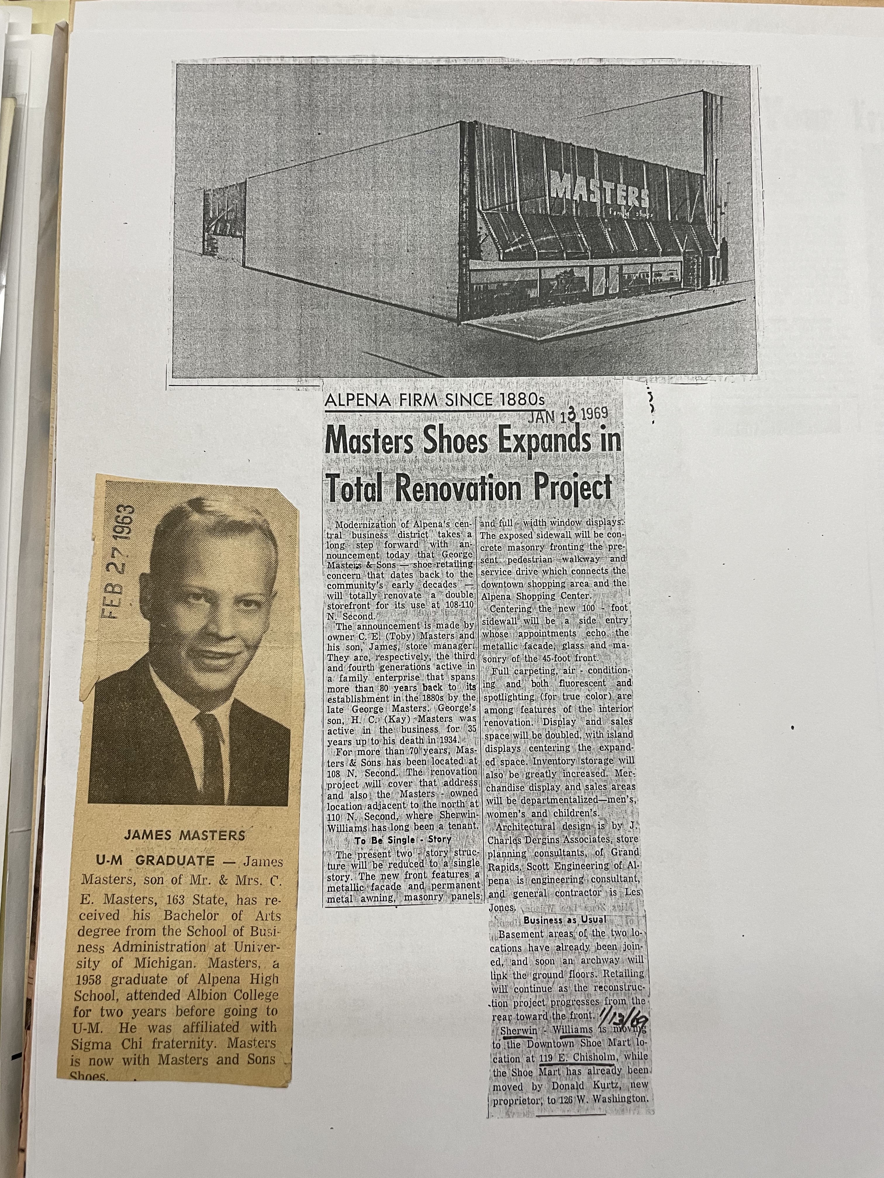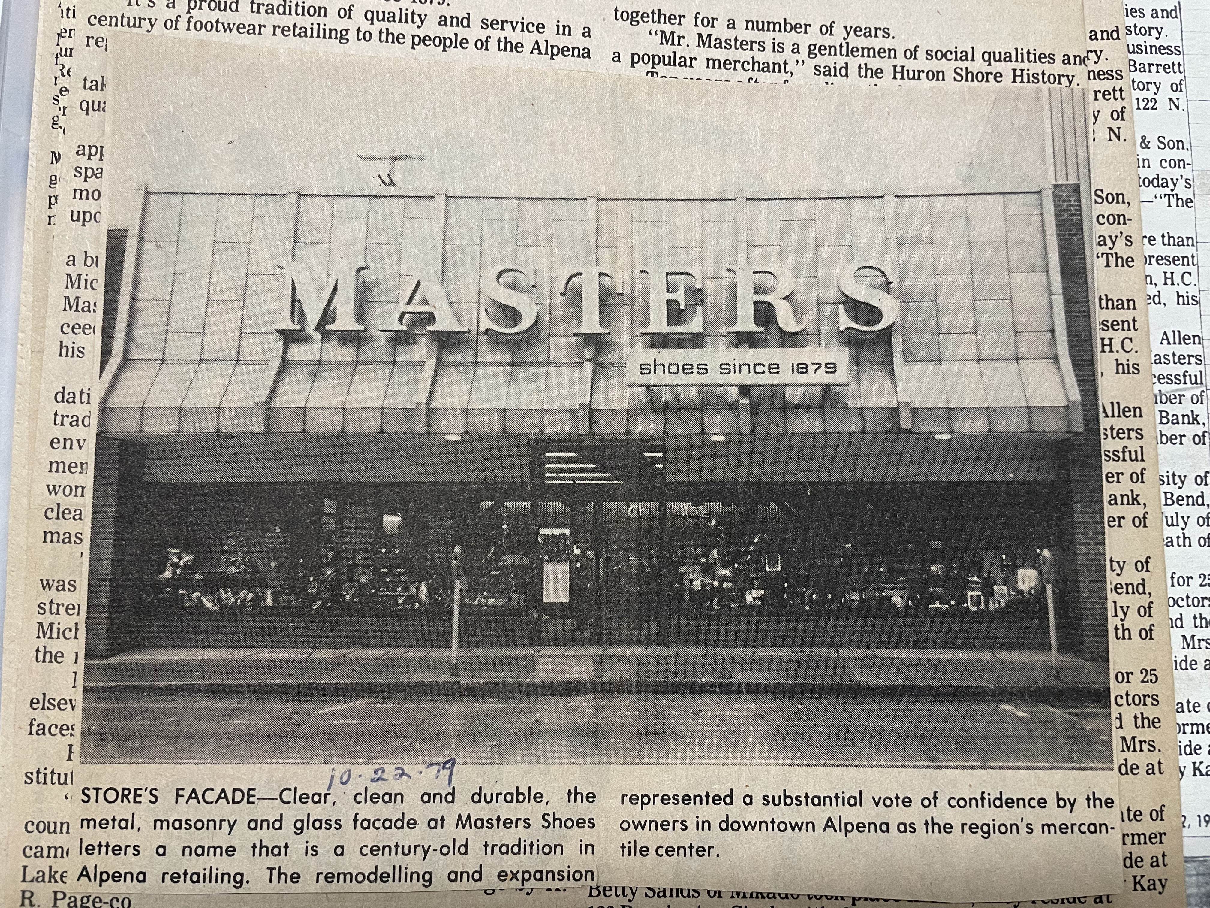 The original owner and founder of Masters Shoes was an English immigrant named George Masters, the great grandfather of Jim Masters, the last member of the Masters family to own and run the business. He started the business with a man named Barrett, so the store was originally known as Masters & Barrett. Along with selling shoes, Masters & Barrett had a textile that they ran together. Over time, George Masters ended up just doing the shoe business and it was handed down to Claire Masters, Jim Masters’ grandfather. Claire passed the business down to Toby Masters who had originally been in the insurance business in Indiana but came back to go into the shoe business. Jim Masters graduated from the University of Michigan in 1963 and then was drafted, spending two years in Fort Polk, Louisiana. Afterwards, he joined his father and worked under Masters Shoes. In 2002, it became Masters and LaLonde Shoes when Jim Masters and Paul Detloff combined their businesses to give themselves and each other more time to enjoy their lives. In 2011, Masters and LaLonde Shoes was sold to Shawn and Steve Straley. Although the business closed in 2020, some of the remaining inventory remains at Alpena Furniture & Flooring, which Steve currently owns.
