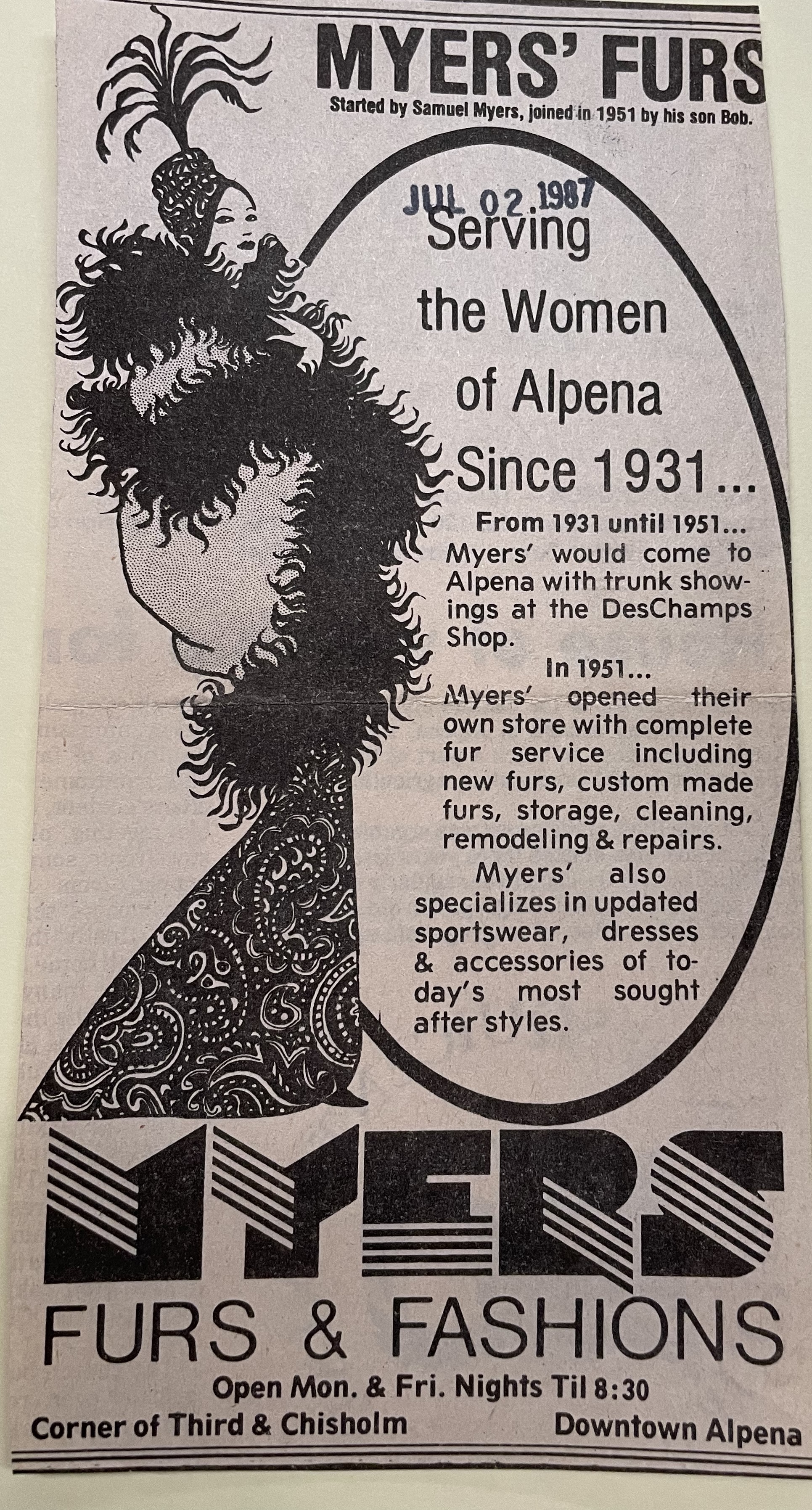 Myer’s Fashions Etc. did not start out as a women’s clothing store. Ellen Gould’s grandfather started the business and used to travel with furs, and he would sell them and repair them. He used to come from Appleton, Wisconsin to sell his furs at the the DesChamps shop which is where Regalo Luxury Gifts is now. While the business was based in Appleton, WI, it was called Myer’s Fur Post, traveling all over the U.P. selling their furs. As they transitioned out of furs, they became a clothing store. Originally, their store was located in the pocket park on River Street until the front of their building started falling off and forced them to move. The bar that is now part of the pocket park used to be the fur vault. They moved to their current location in 1971 and started adding clothing. Ellen started working in 1972 with her father until his passing in 2014 and Ellen took over.