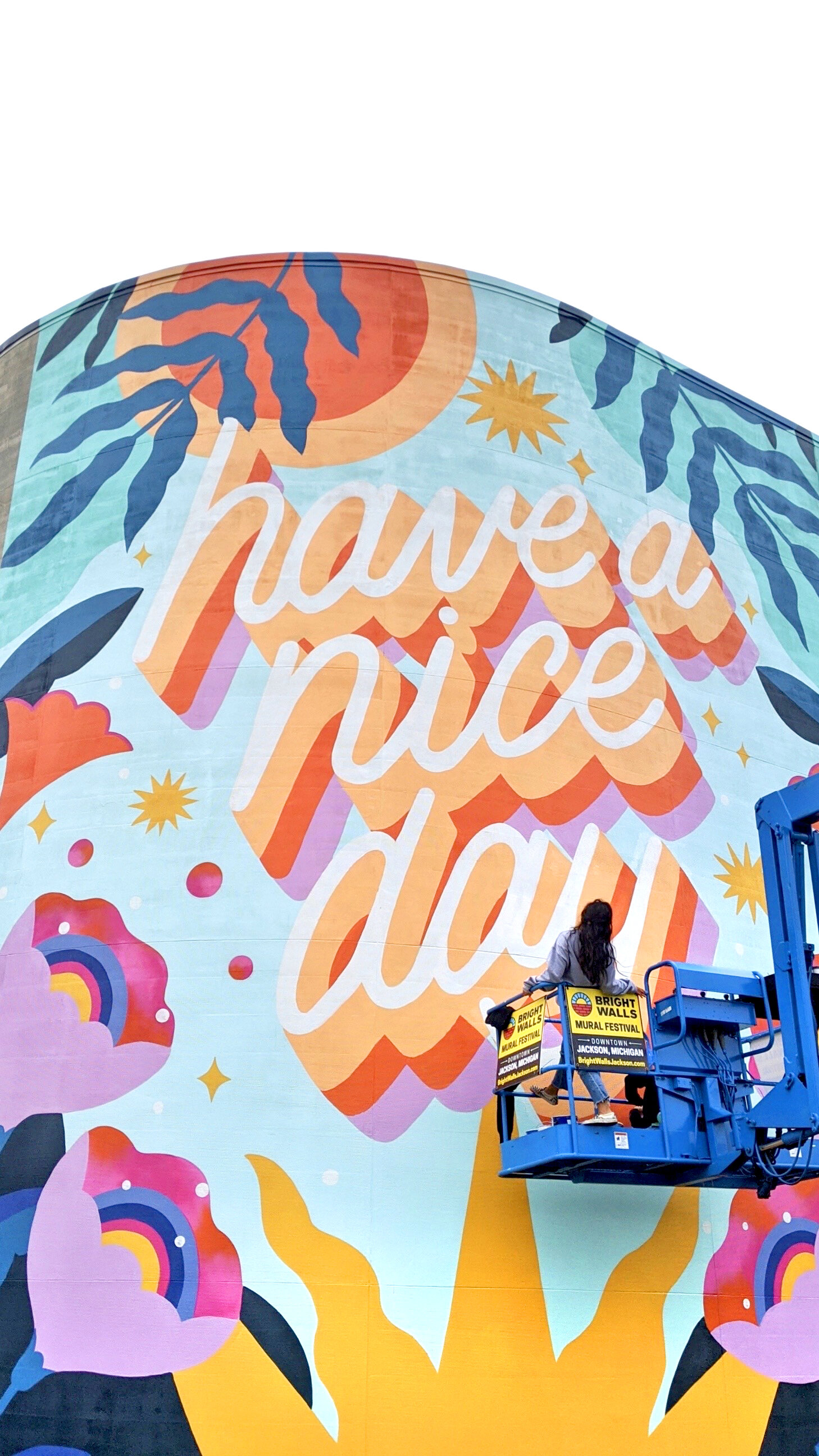 “As an illustrator and muralist, I find that a majority of my work is heavily inspired by the nature and communities that surround the particular project I am working on. By slowly down, taking notice of local characteristics and pulling inspiration directly from the project’s surroundings, I aim to make the final results unique to the environment in which they will exist. I want to bring bold, colorful and positivity to Alpena bring people together with my mural!”
