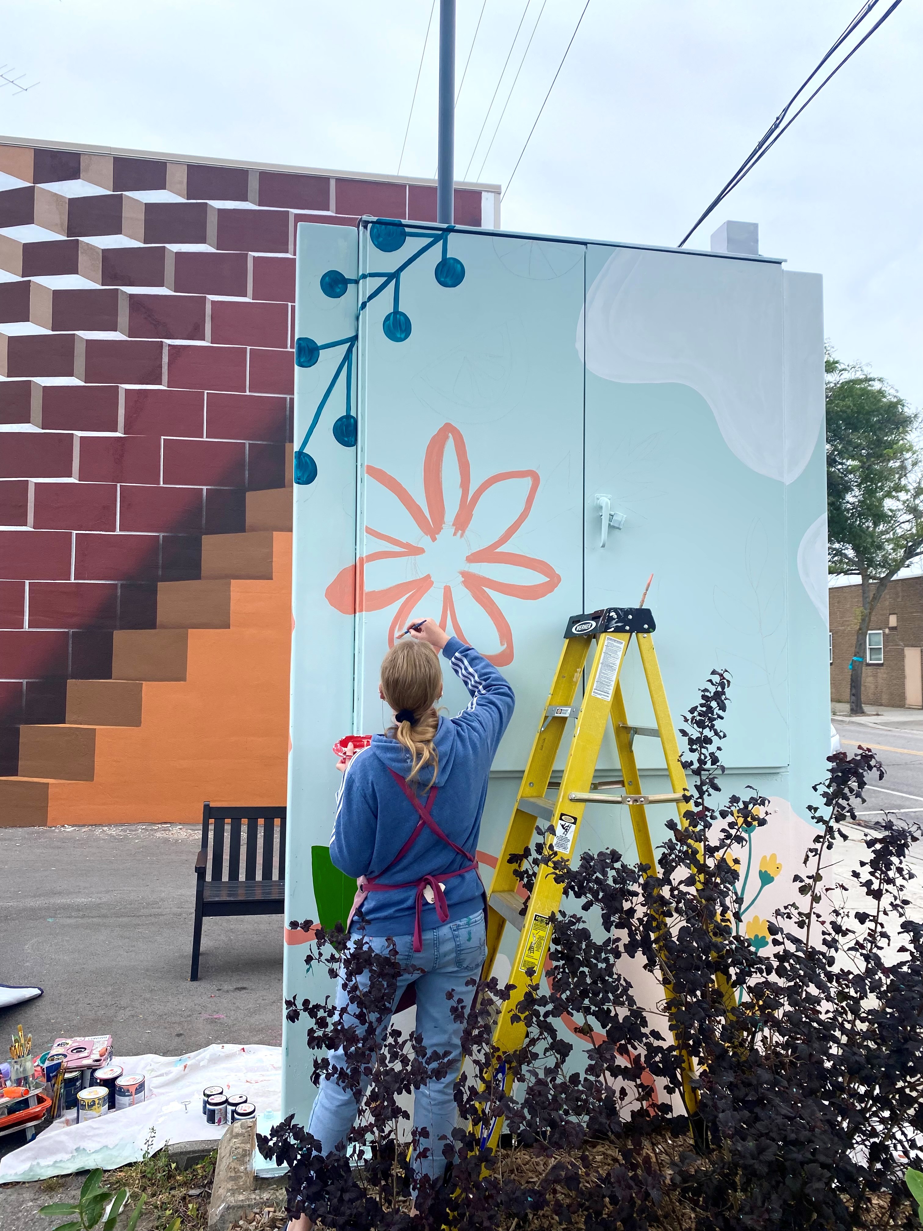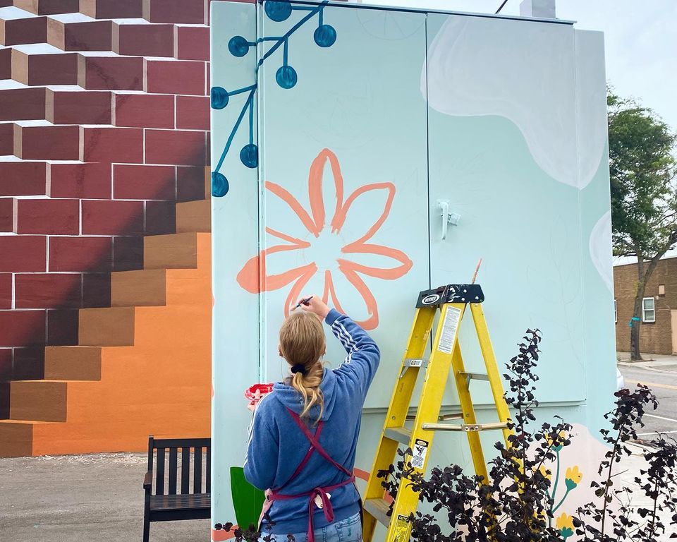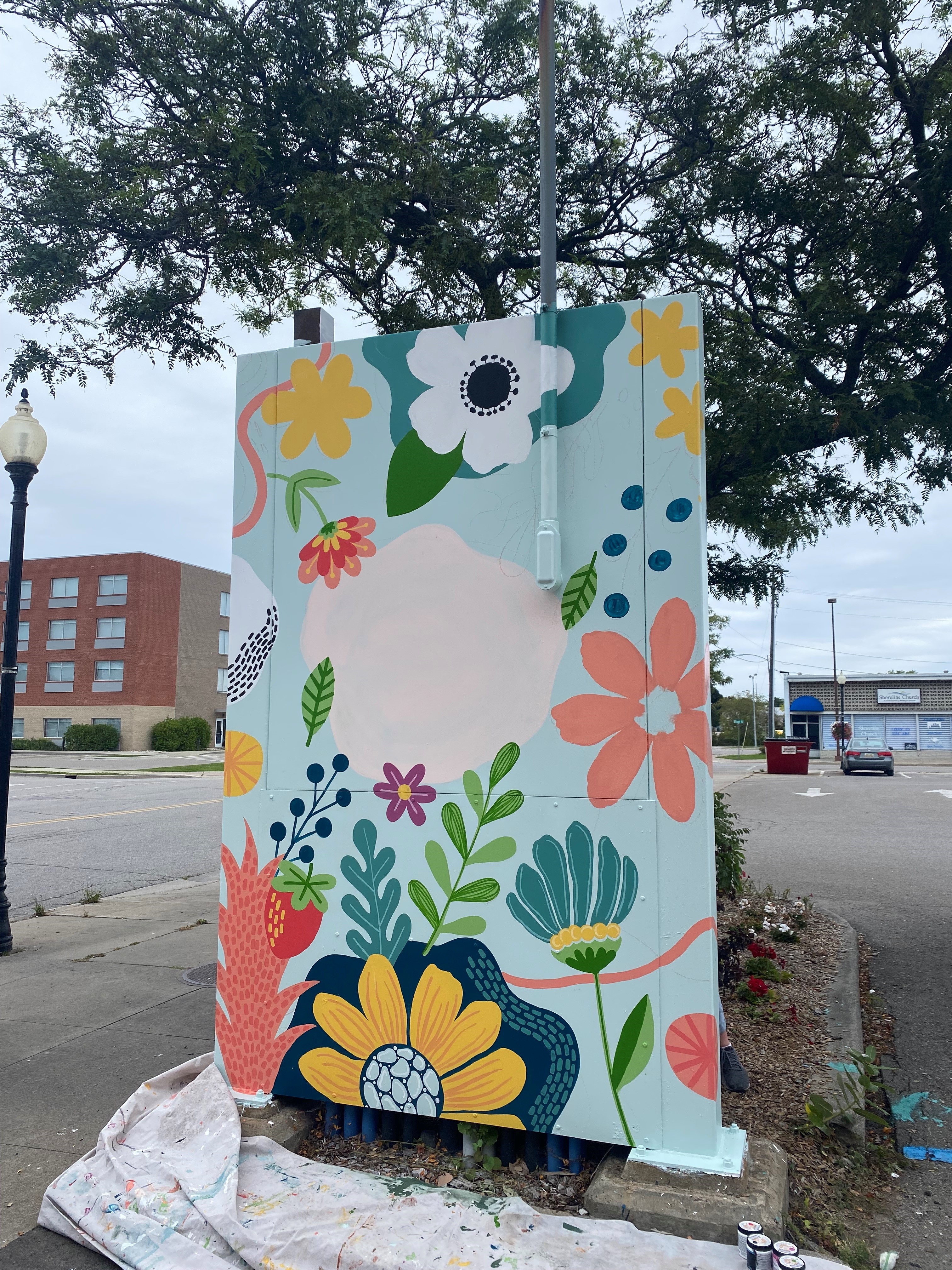 This week, painting started by local artist Mariah Brancheau of Lovely Little Lettering Co. on two power boxes that mark the entrance and exit to the alleyway off 1st and 3rd Avenues. Brancheau has previously participated in the Fresh Waves project with a piece down at the marina and also live-painted at the Alpena Flower Festival.